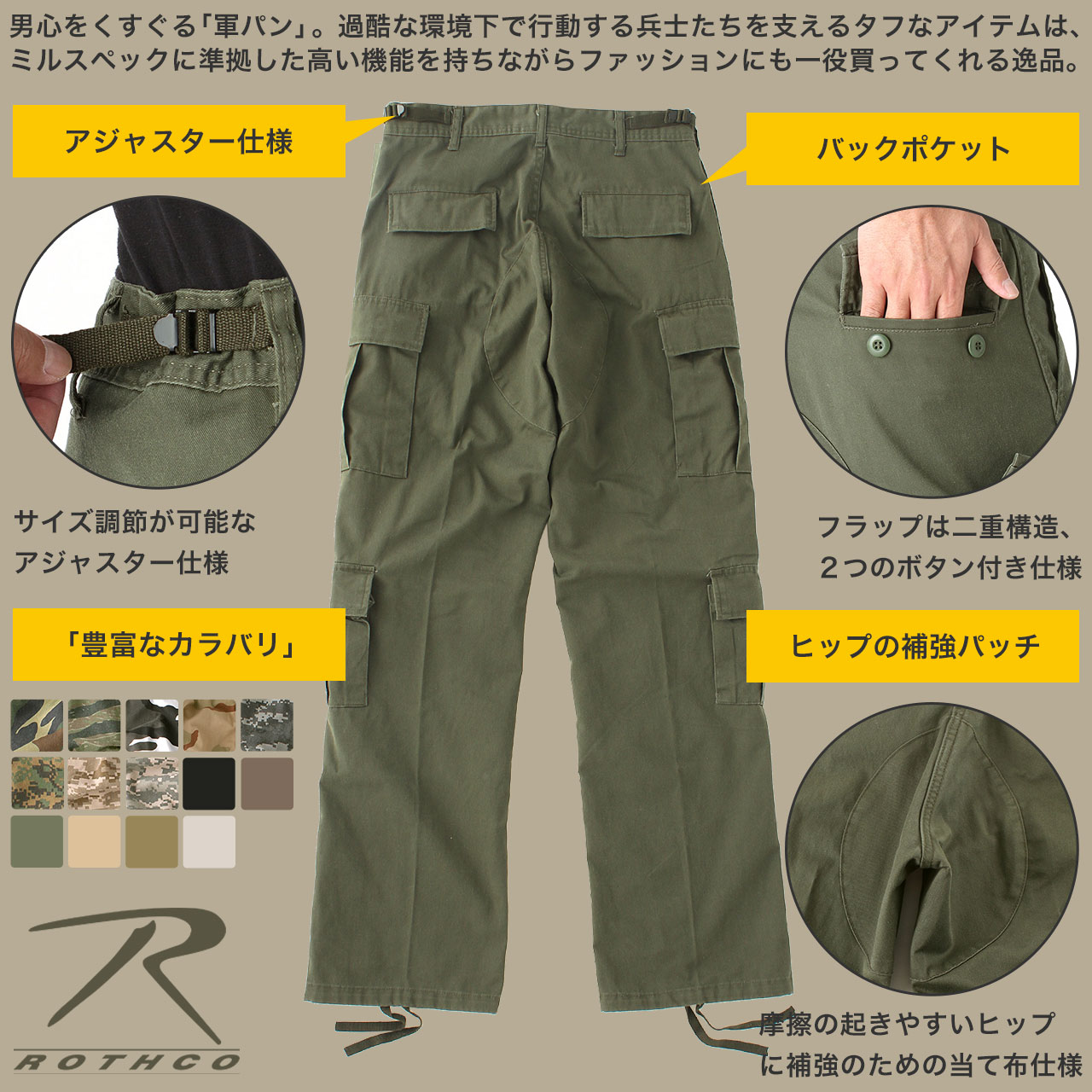 ロスコ カーゴパンツ メンズ ジッパーフライ ヴィンテージ加工 ファティーグパンツ パラトゥルーパー 大きいサイズ USAモデル 米軍 ミリタリー 迷彩 20140417 20150116【R】20170427【R】20210507 プレゼント用のギフトラッピングはコチラから ▲ラッピング レギュラー ▲ビッグサイズ ブランド説明 ROTHCO ロスコ 60年以上の歴史を持つアメリカを代表するミリタリーウェアブランド COMBAT TESTED SINCE 1953 ROTHCO1953年にアメリカ東海岸のマンハッタンでMilton Somberg (ミルトン・ソンバーグ)によって設立されたROTHCOは、 創立した当初よりアメリカの陸海軍に ミリタリー製品を供給してきた伝統あるミリタリーウエアブランド。